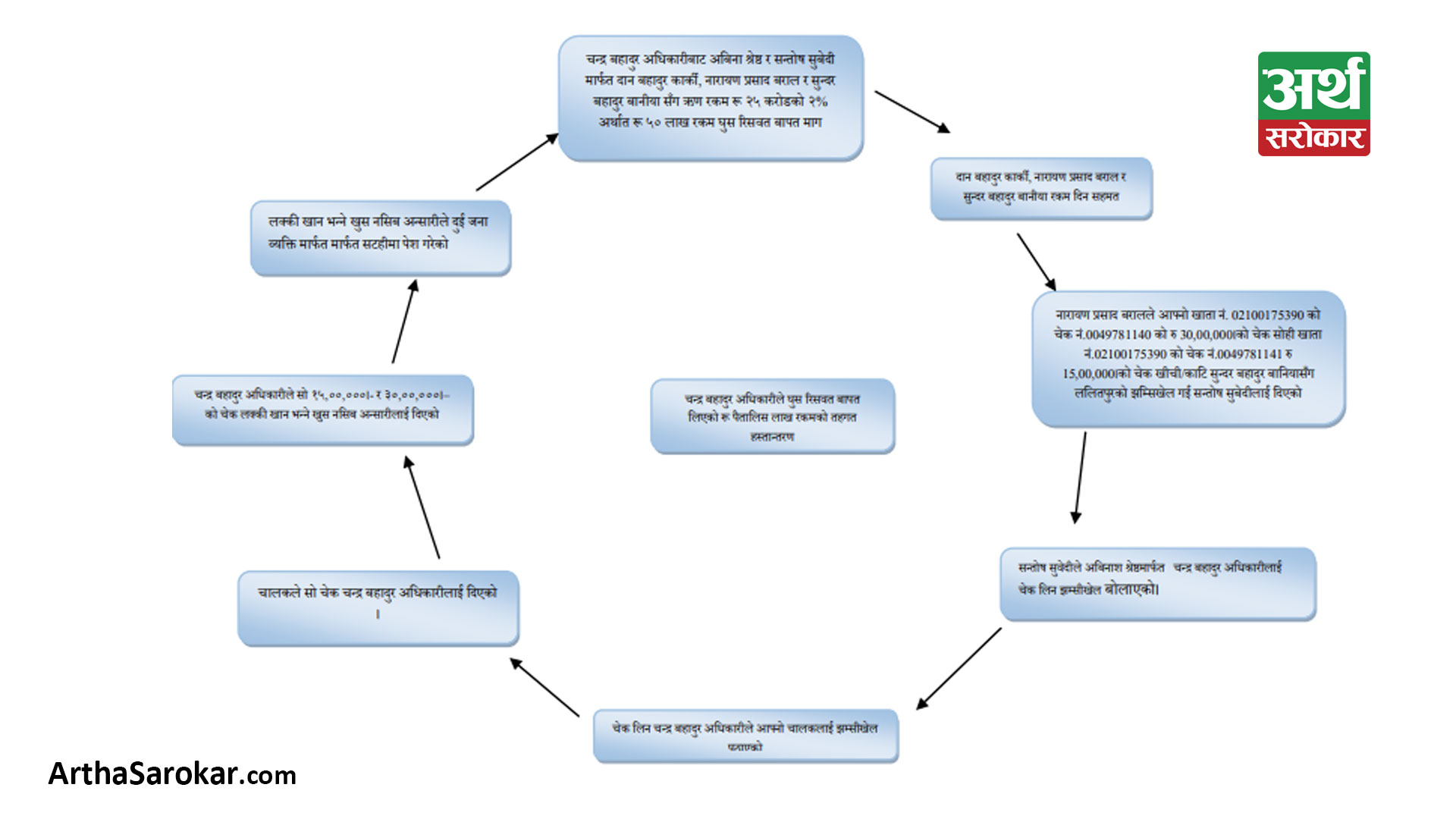 यतिसम्मकि सन्तोष सुवेदी मार्फत निकै चलाखीपूर्ण तरिकाले घुस मिलाइएको छ । घुसको डिल भएपछि सुरुमा सुवेदीले घुस खाएको देखिन्छ । त्यसपछि २०८१ साल भदौ १६ गते, सन्तोष सुवेदीको एनआईसी एसिया बैंकको खातामा ७ लाख रुपैयाँ जम्मा गरिएको थियो । त्यसको भोलिपल्ट, सो रकममध्ये ५ लाख रुपैयाँ अबिनाश श्रेष्ठको नबिल बैंक खातामा ट्रान्सफर गरिएको देखिन्छ । त्यसपछि अबिनाश श्रेष्ठले सोही रकम अधिकारीकी श्रीमती मधुमाया अधिकारीको राष्ट्रिय वाणिज्य बैंक खातामा ट्रान्सफर गरेको भेटिएको छ । घुस रकममध्ये केहि बिचौलिया सुवेदीले खाएको देखिन्छ भने बाँकी रकम अध्यक्ष अधिकारीले खाएको देखिन्छ ।